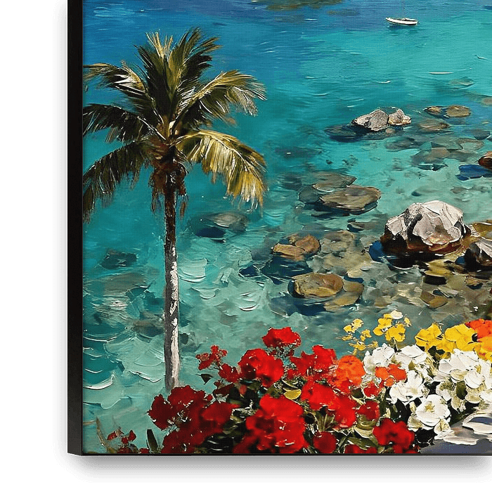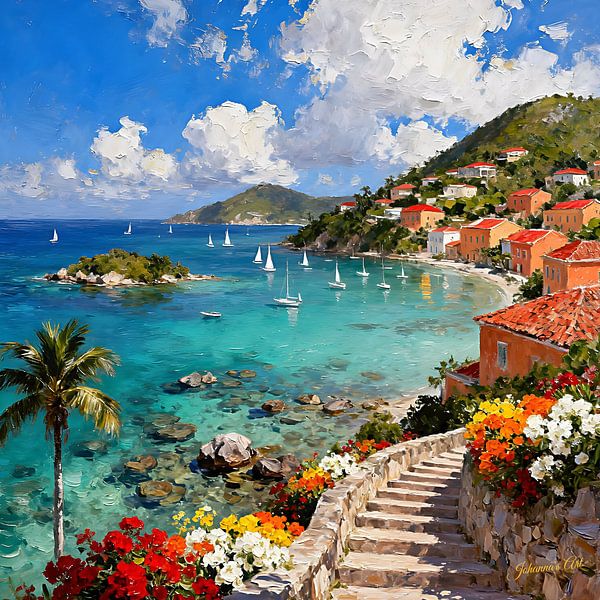 Immerse yourself in the radiant beauty of St. John in the United States with this vibrant, impressionistic oil painting inspired by the charm of St. John. This breathtaking coastal scene captures a sun-drenched town nestled within a picturesque bay, where crystal-clear turquoise waters shimmer under a brilliant blue sky. Rocky islands…