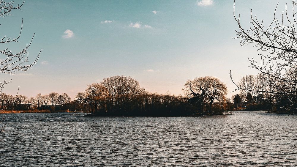 This breathtaking natural landscape showcases the serene beauty of a vast lake surrounded by pristine, natural surroundings. The calm waters reflect the deep blue sky, stretching effortlessly to the horizon, where sky and water come together in perfect harmony. The lake's bright hues create a mirror effect, making the horizon seem to disappear into distant nothingness, evoking a sense of infinity and tranquillity.
