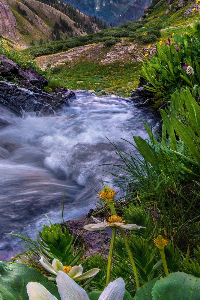 Fine Art photo of a scenic summer sunset high in the mountains above Silverton, Colorado. I captured this beautiful scene on a summer camping trip. I setup camp just above this scene and made dinner. As I was finishing dinner a distant storm rolled in on the horizon. A few minutes later that storm started to pick up the colors of the sunset. I quickly gathered my gear and started looking for a nice foreground. I scampered down some rocks and found this nice white marsh marigold and creek flowing towards the mountain. This was the shot of the night!