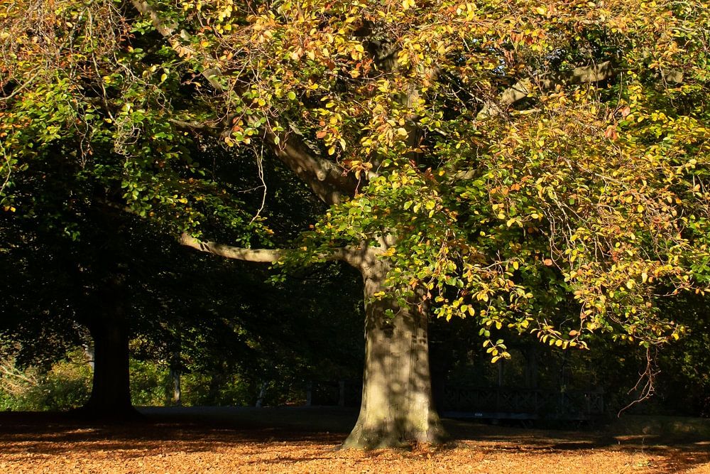 Beautiful yellow and brown autumn leaves under the tree. Atmospheric autumn image.