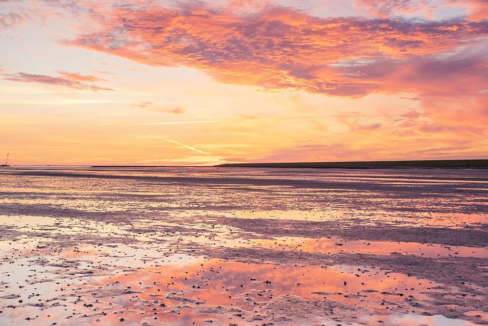 I had agreed with a photographer friend who often stays on the island to go out one evening together. Our idea was to photograph the sunset at the Wadden Sea. We had agreed to meet at the Veerhaven harbour and would then see what the destination on the mud flats would be. We cycled along the mud flats looking for a nice spot, it was low tide. While cycling, we saw thick clouds coming up from the North Sea side and it looked like it was going to close up completely, we were already afraid that the beautiful sunset wasn't going to happen. We decided to carry on anyway and by sunset we arrived in Hollum, fortunately it hadn't closed in. The sky was already starting to colour beautifully and we decided to walk onto the Wadden Sea (not useful if you've just got new shoes :) ).