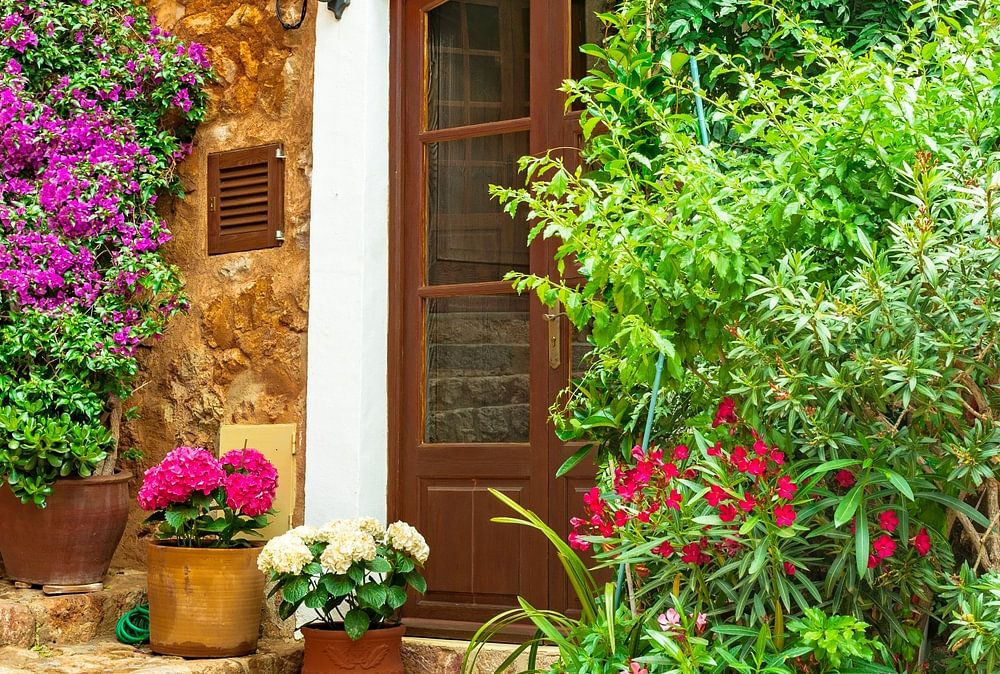 Beautiful flowers street in old village of Fornalutx on Mallorca island, Spain