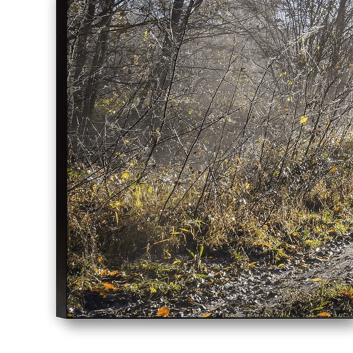 Buy this landscape artwork Beautiful forest path with different kinds of trees and sunrays on a cold morning, copy space, selec by Maren Winter on canvas, ArtFrame, poster and wallpaper, printed on demand in high quality.