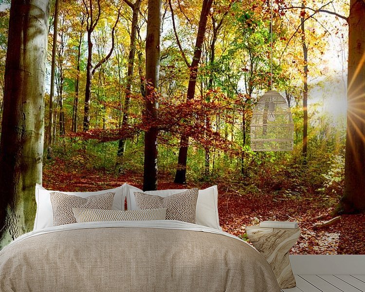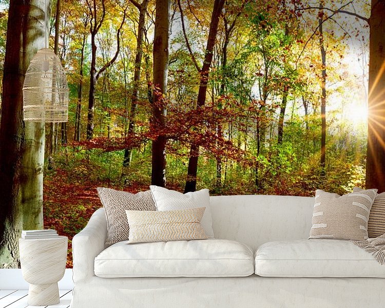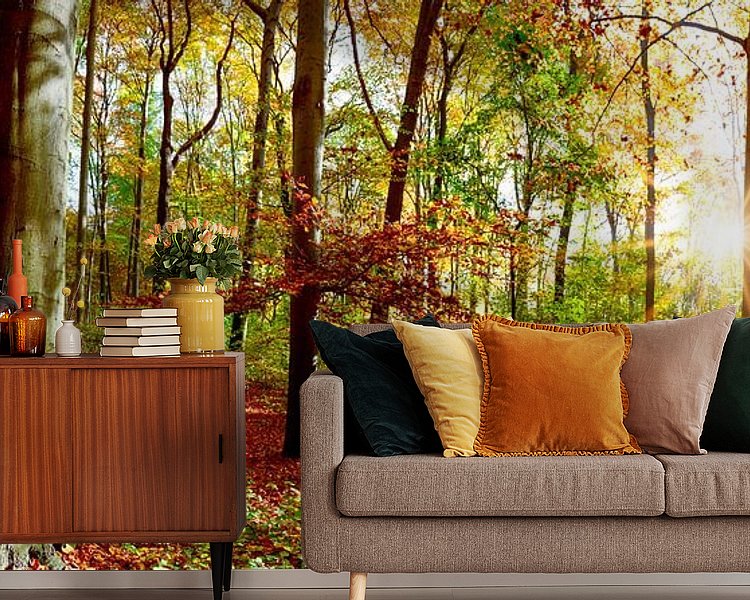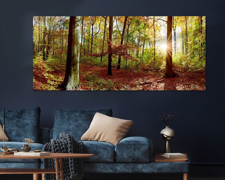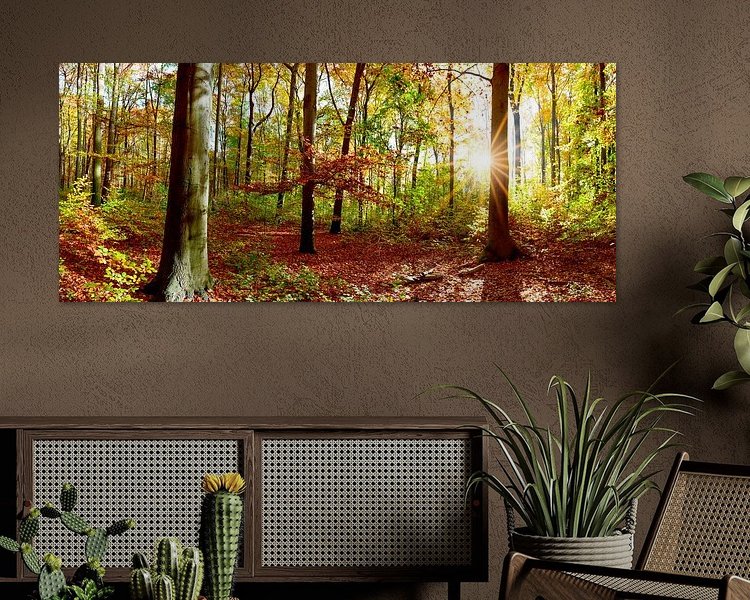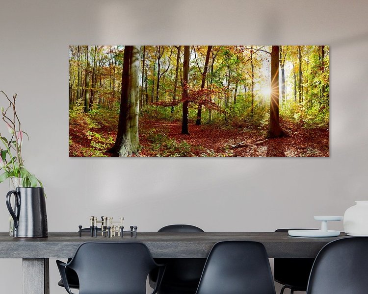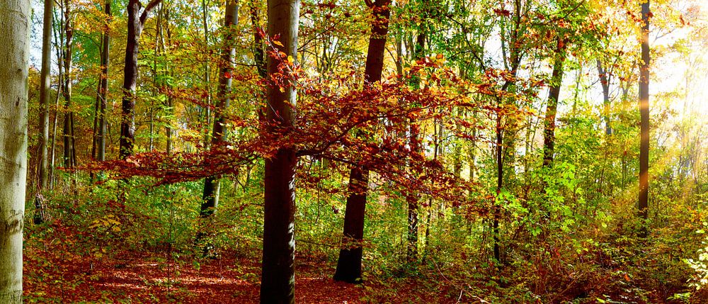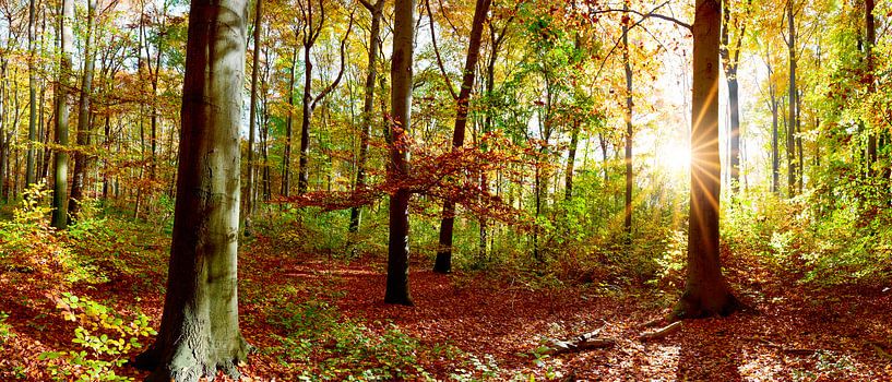 Beautiful forest panorama in autumn with bright sun shining through the trees