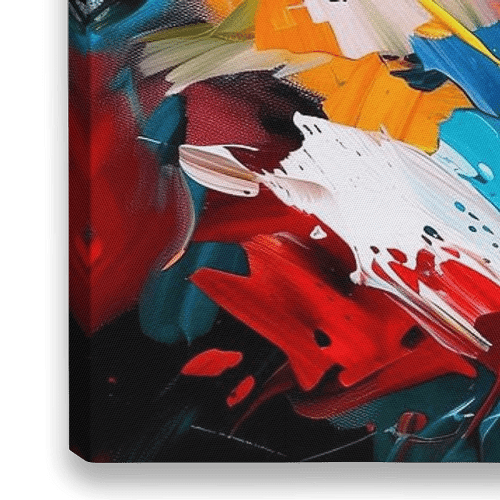 This dynamic abstract artwork uses a powerful colour palette set in bold expressive strokes. It contributes to a sense of movement and emotion, exuding an undeniable energy and intensity.
