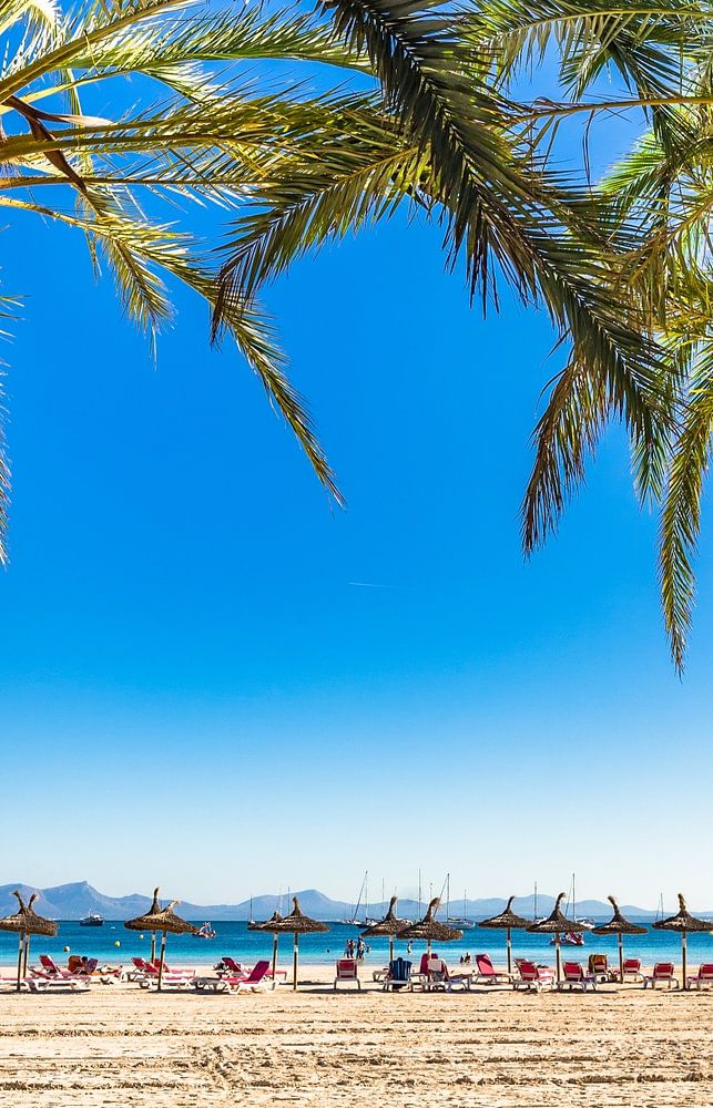 Beautiful seaside on Mallorca island, beach Platja de Alcudia with palm trees, Spain Mediterranean Sea, Mallorca, Balearic Islands, Balearic Sea, Mediterranean Sea, Spain