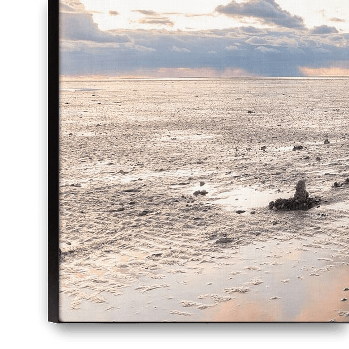 A beautiful wide view over the dried up Wadden Sea, during sunset. The clouds reflect in the water. The poles, the clouds and the footsteps of an earlier Wadloper lead you to the horizon. I am standing here about 100 meters off shore in the mudflats, near Wierum. It was a cold evening, with beautiful clouds in the sky. An amazing…
