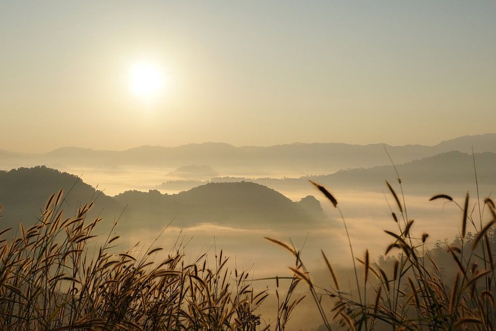 Magical sunrise in the North of Thailand. The fog in the valley will soon be dispelled by the warm rays of the sun.