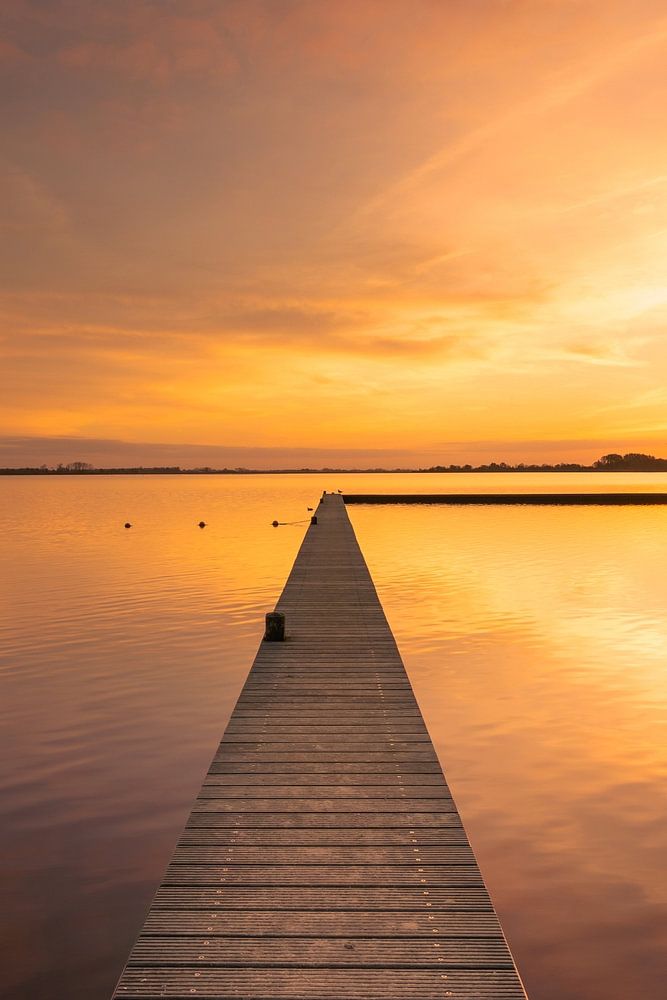 Photo of the Schildmeer near Steendam, with super nice conditions. The weather was calm and sunny all day. So the water was a very nice mirror. Which also made the sunset reflect very nicely in the water. The jetty seems to disappear into infinity. The photo was taken in November 2024, Groningen.