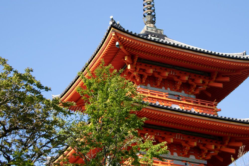 A recognizable Japanese temple in Kyoto. The red tower rises above the green trees. A beautiful spring day in May.
