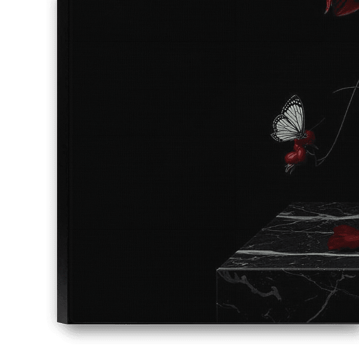 It exudes the dramatic atmosphere of a Baroque/Classical still life, with an intense focus on detail and colour.