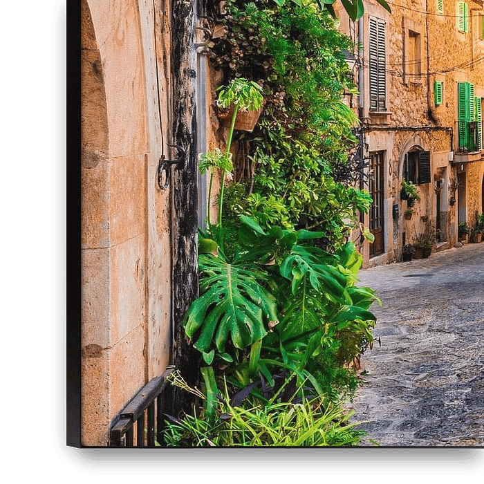 Buy this flower art Beautiful view of idyllic street in Valldemossa village on Mallorca island, Spain by Alex Winter on canvas, ArtFrame, poster and wallpaper, printed on demand in high quality.