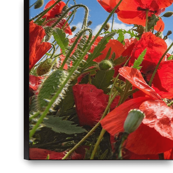 Buy this flower art Beautiful view of red poppy meadow field with sunbeams on blue cloudy sky background by Alex Winter on canvas, ArtFrame, poster and wallpaper, printed on demand in high quality.