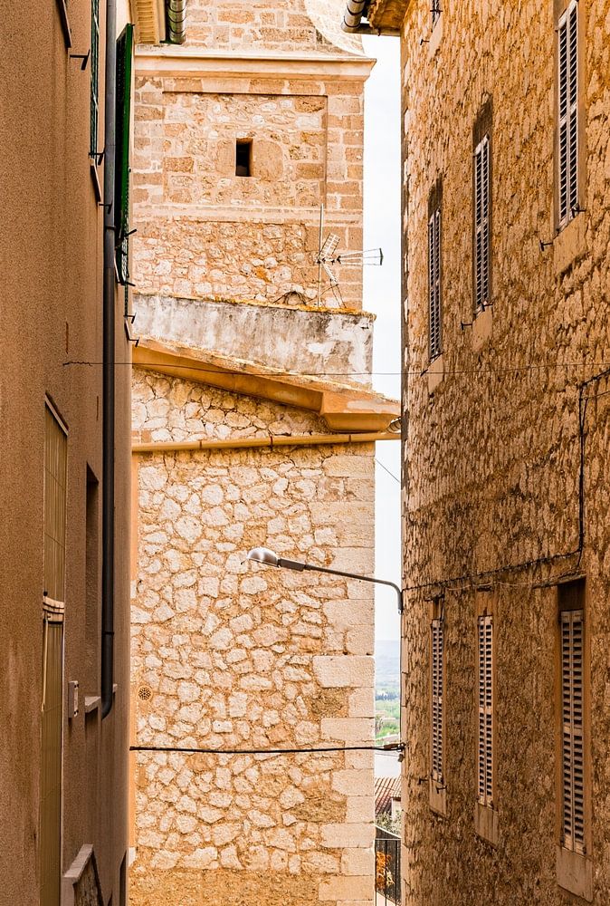 Beautiful view of street whith church steeple in old village of Lloseta on Mallorca island, Spain