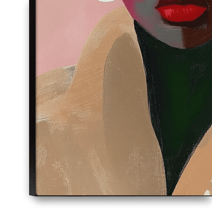 A powerful, expressive portrait study on a pink background. The woman has a deep, confident look with intense red lips and brightly applied blush. Her dark skin contrasts beautifully with the soft pink and beige tones in the background and her coat. The white earrings add a modern, minimalist accent, while the coarse brushstrokes give a…