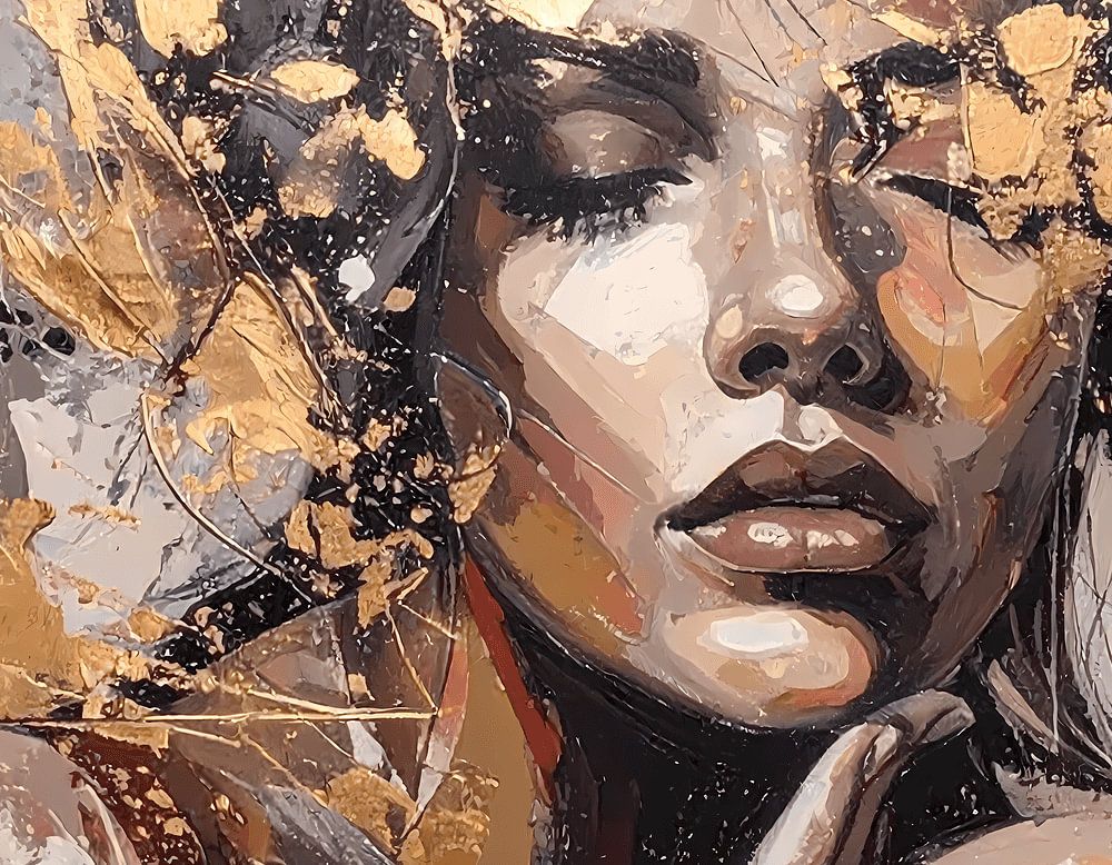 A warm and earthy colour palette dominates: shades of taupe, beige and gold, complemented by white and soft flesh tones. There are also light accents that almost shimmer, creating a shiny, rain-like or crystal-like effect.