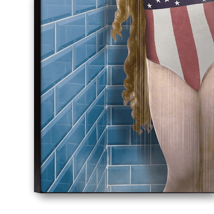"Beauty in shower" is a surrealistic collage where the female figure taken from neoclassical paintings is tuned up with a swimsuit and a pinup, suggestive attitude. Mixing classic paintings with pop elements, the result changes the original concept completely. She's taking a shower in the bathroom with an influencer's sexy attitude.