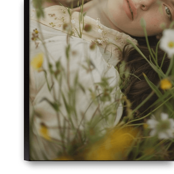 In the picture, a young woman lies in the middle of a blossoming field, surrounded by colourful wildflowers. Her gentle facial features and natural freckles lend her a fragile charm. The harmonious combination of delicate fabric and vibrant nature creates an atmosphere of calm and light-heartedness.