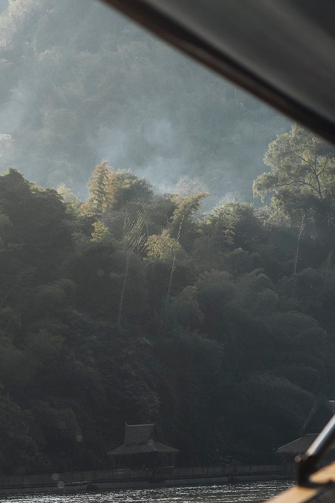 Thailand 2022. Quiet boat ride on the River Kwai, amid greenery. Foggy day.