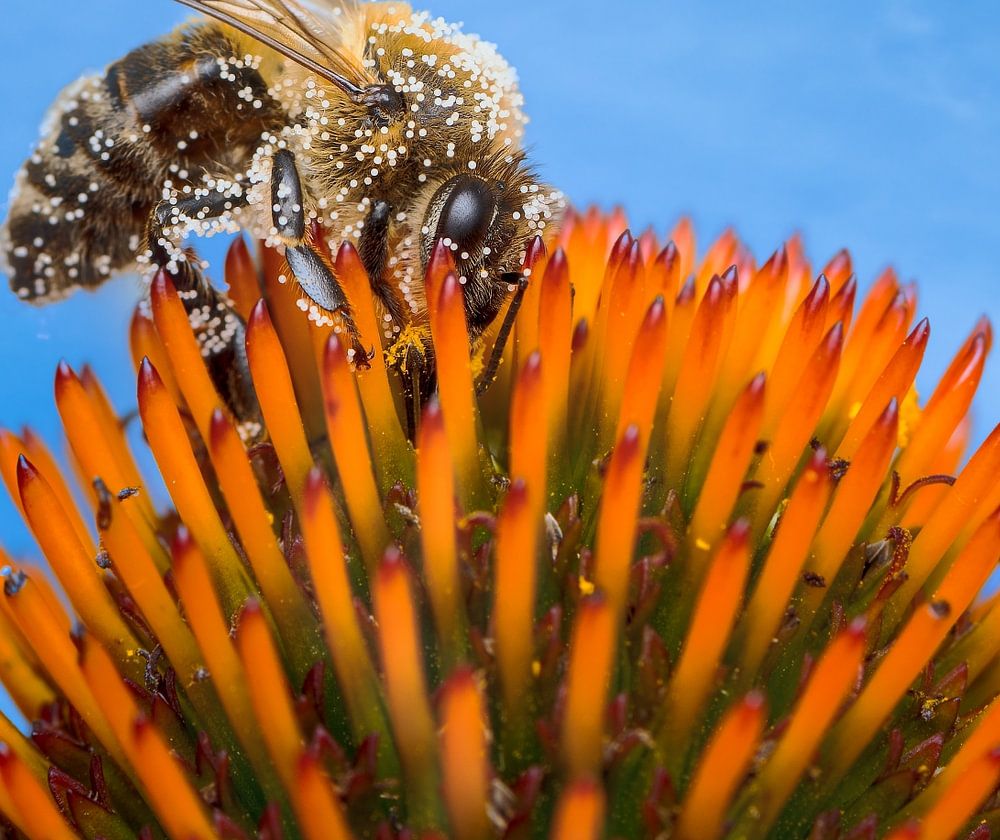 Macro of a bee collecting nectar in an echinacea flower blossom