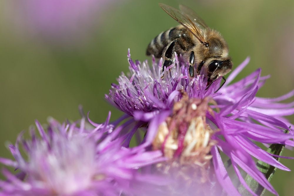 A small honey bee sits in the middle of a field of blooming wildflowers. The bee is looking for pollen. The sun is shining. The flowers are purple.