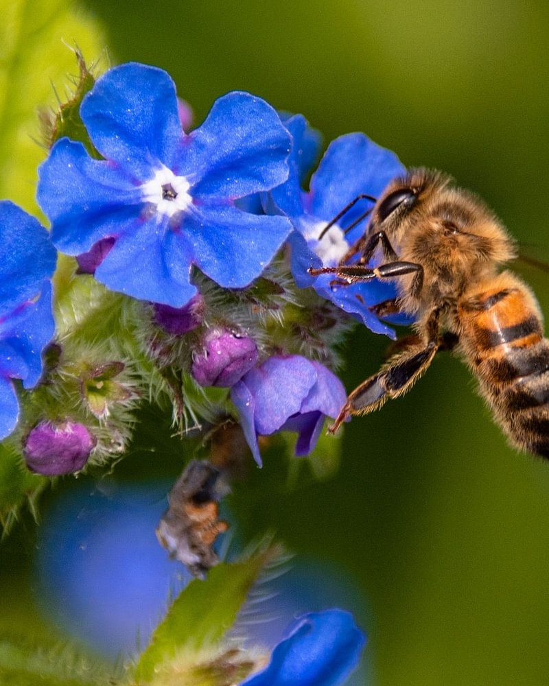 This blue flower, also called the common ox tongue is very popular with the honey bee. The colors green and blue speak to each other well. A very pretty honey bee on top and the picture is complete.