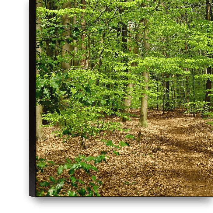 Photo taken in the forest of Emmen in Drenthe. The sun shines on the pale green leaves of beech trees. A path leads into the forest. What I love about beech trees are the horizontal branches.