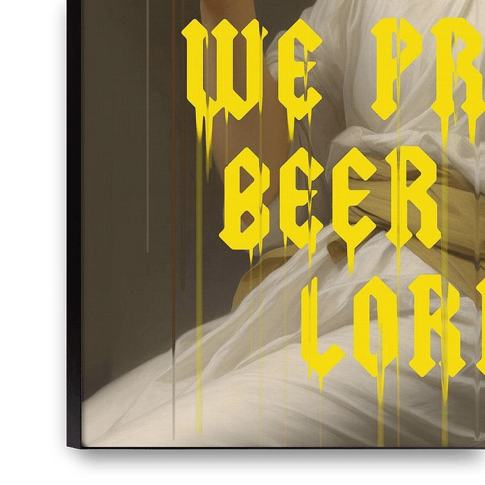 "Beer Us Lord" is a unique tribute to the divinity of beer, merging the solemnity of neoclassical art with the energy of urban style. In this artwork, classical iconography is combined with modern elements to celebrate the culture and enjoyment of an ancient beverage.