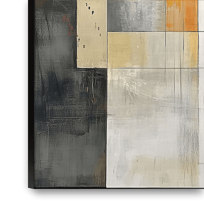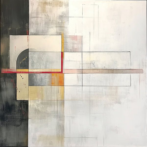 Beige Abstract | Off-white with a red line – This is an abstract painting featuring geometric shapes and delicate line work, a spacious off-white and beige background, a dark column on the left and a striking horizontal red and yellow line running through the centre; this abstract painting also features a semi-circular shape and soft…