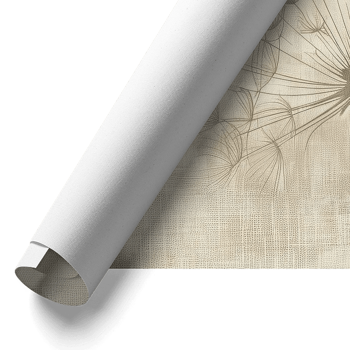 Beige Flower Painting - This flower painting shows three prominent dandelions, each detailed with thin, delicate seed fluff radiating from the dark, round centres. The flowers are depicted against a neutral, textural beige background, which has a dusty or linen-like appearance. The play of shadow and light in the background creates…