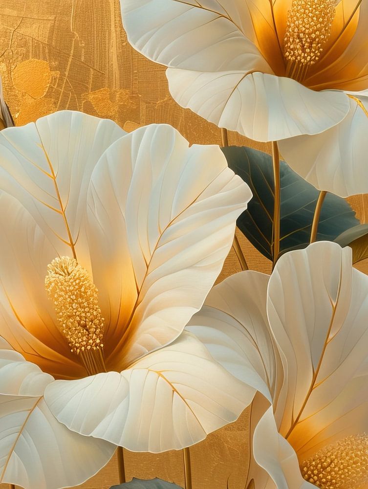Beige Trumpet Climbing Plant | Golden Serenity - This flower painting shows large, graceful Beige Trumpet Climbing Plants framed with golden accents, giving an elegant and luxurious look.