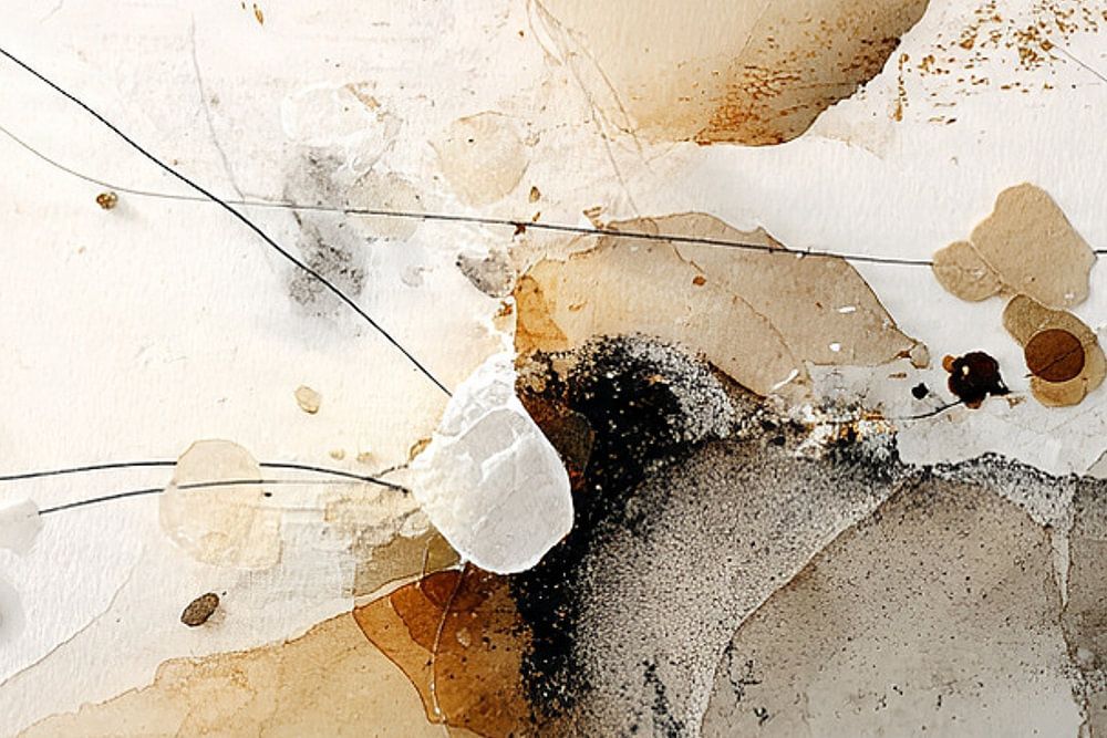 This artwork depicts an abstract composition in which organic forms, transparent patches of colour and fine black lines come together to form a harmonious whole. In the centre, you can see a cluster of flowing forms in shades of beige, brown, grey and black, complemented by subtle splashes and grainy textures that create depth and…