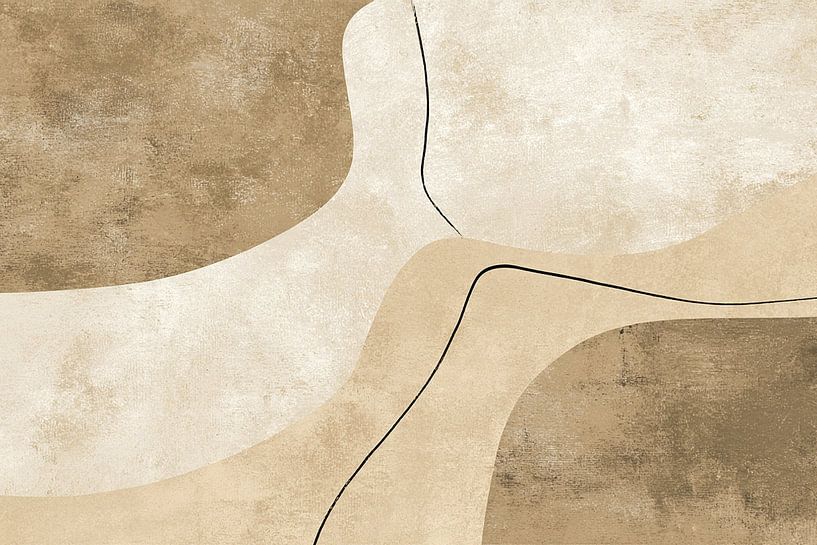 This artwork features an abstract composition of flowing, organic shapes that overlap in soft earth tones. It features areas of colour in beige, sand, light brown and taupe, combined with subtle textures that give the surface a natural, slightly grainy appearance. Thin, irregular black lines run through the composition, intersecting and…