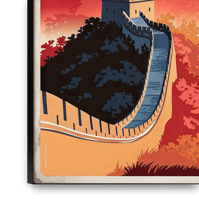 A majestic backdrop unfolds with soft colours and stylised mountains, while the Great Wall winds through the landscape like a shimmering ribbon. The warm light of dusk envelops the scene, enhancing the sense of timeless beauty and grandeur in the heart of China. Beijing beckons with all its splendour and history!