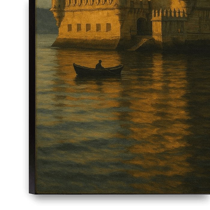 This contemplative artwork features the majestic Belém Tower (Torre de Belém), a UNESCO World Heritage site and a prominent symbol of Portugal’s Age of Discoveries. The tower rises out of the tranquil waters of the Tagus River, its detailed Manueline architecture warmly illuminated by the soft, fading light of twilight. The entire scene…