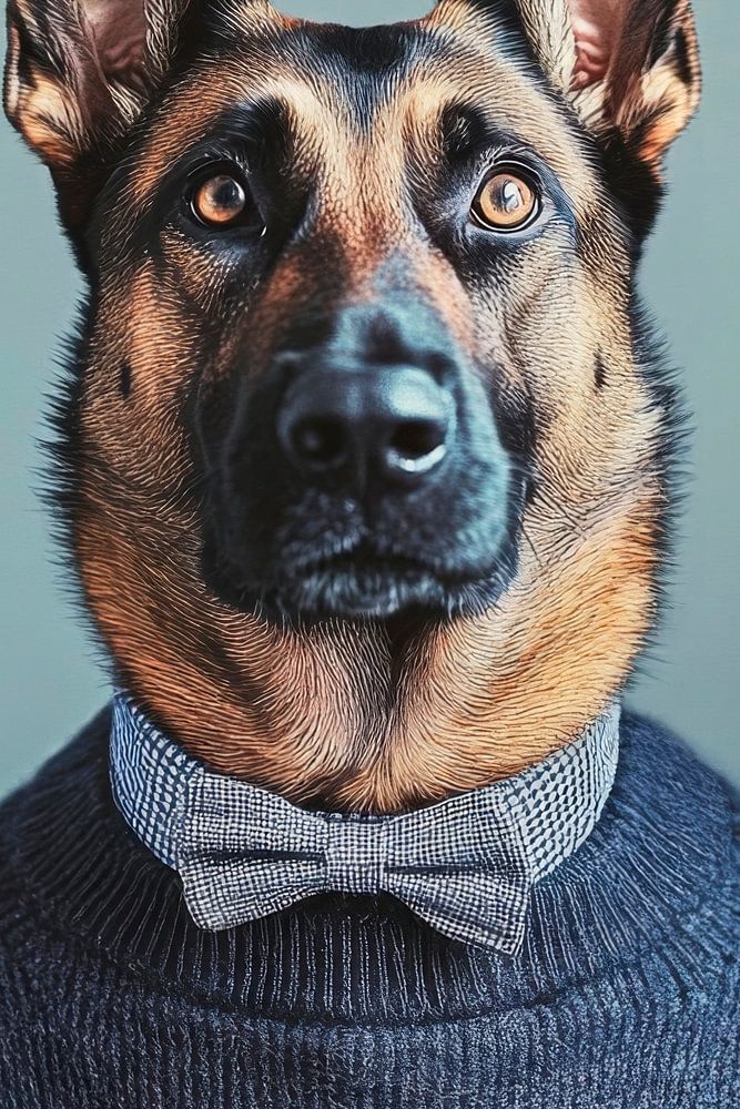 With an elegantly tied bow tie or a stylish jumper, this Belgian Malinois radiates intelligence and charm. Its attentive gaze and pointed ears convey a mixture of alertness and friendliness. This animal model is the epitome of loyal elegance, ready to conquer the world with a charming smile.
