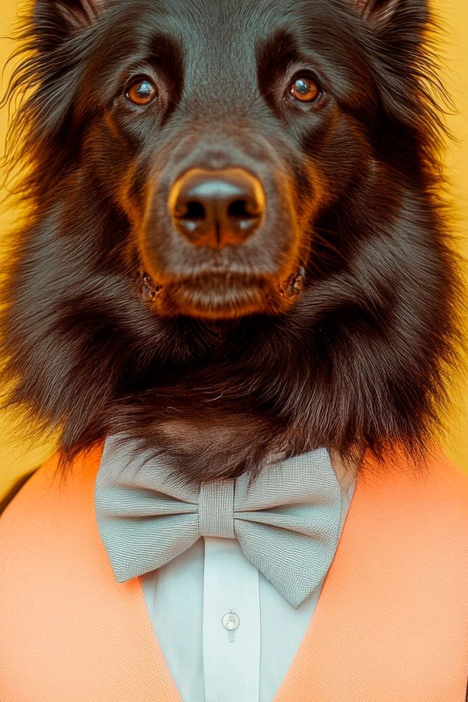 In an elegant, apricot-coloured dinner jacket, this Belgian Tervuren appears with a majestic bearing and a charming look. His silky black hair and attentive ears give him a very special aura, while the stylish bow tie emphasises his aristocratic charm. A true gentleman on four paws!