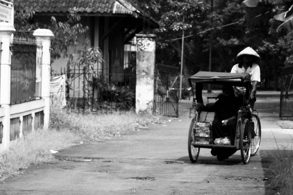 het kan niet meer azië zijn zoals op deze foto wordt gepresenteerd, ten midden van West Java. Abang becak is hoe we de taxifietsen noemen in Indonesië, harde respectvolle stiel.
