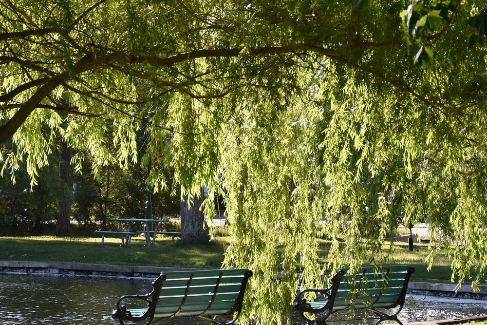 Benches under trees in summer, Trois-Rivières, Quebec, Canada