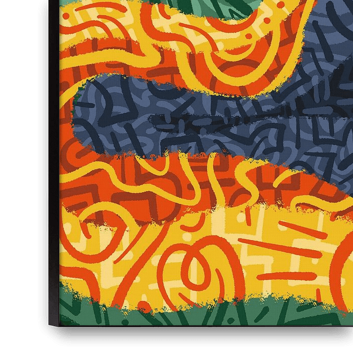 Layered textures and bold organic shapes intertwine, suggesting unseen movements beneath the surface. The vibrant contrast of warm and cool tones creates a sense of depth, as if the forms are quietly shifting and breathing within the space. This artwork feels special in an interior because its layered patterns and organic shapes invite…