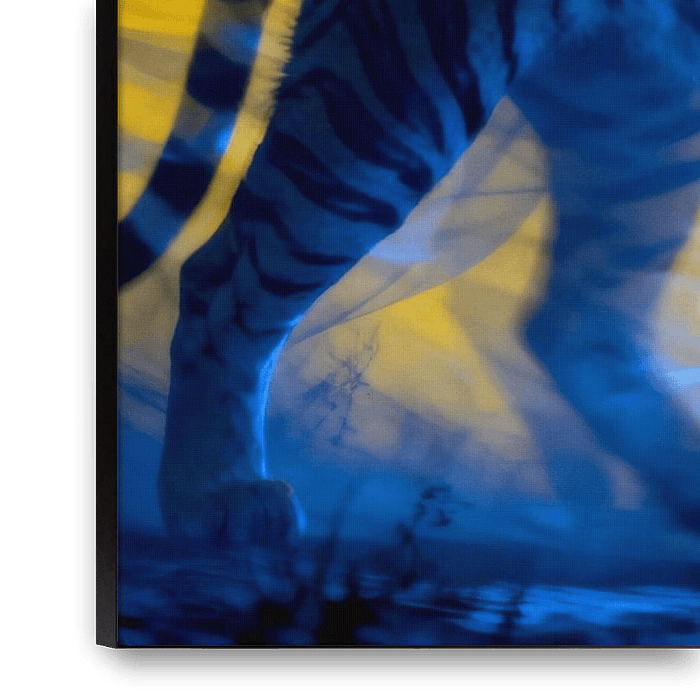 This impressive artwork captures the majestic power and flowing grace of a Bengal tiger striding forward with determined steps. The image uses vivid colour contrast, with the tiger's natural orange and black stripes standing out sharply against a bold yellow background, while dynamic blue shadows and motion blur emphasise the animal's…