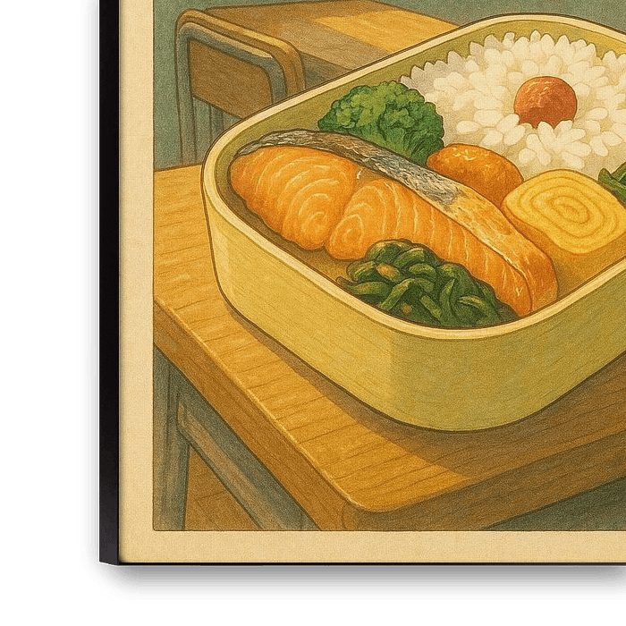 This nostalgic Bento poster celebrates everyday Japanese food culture in anime-style watercolor design. A homemade bento box filled with rice, salmon, tamagoyaki, and vegetables rests on a school desk, while sunlight streams through the window revealing the countryside. With its warm tones and hand-painted details, this illustration evokes a sentimental and cozy feeling, reminiscent of Japanese school life. Perfect for kitchens, dining rooms, classrooms, or cultural-inspired spaces, it adds warmth and character to any wall. Beyond being decorative, it represents tradition, family care, and the artistry of Japanese meal preparation. Food lovers, anime enthusiasts, and art collectors alike will appreciate its storytelling quality and cultural authenticity. This poster also makes a thoughtful gift for travelers or anyone passionate about Japanese design. Add charm, nostalgia, and balance to your interior with this anime-style bento illustration.