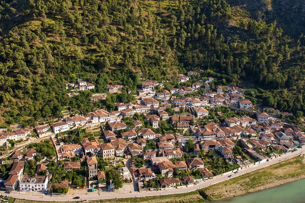 Berat lies wedged between the mountains. On both sides of the river Osum small white houses are built. When the evening falls the town is illuminated by thousands of yellow lights from the many houses. A beautiful sight.
