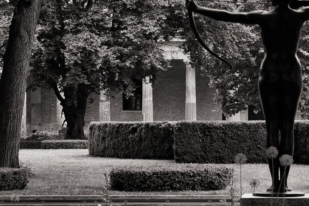 The photo shows the colonnade courtyard in front of the Alte Nationalgalerie, with the bronze sculpture 'Bogenspannerin' by Ferdinand Lepcke (1905) in the foreground.