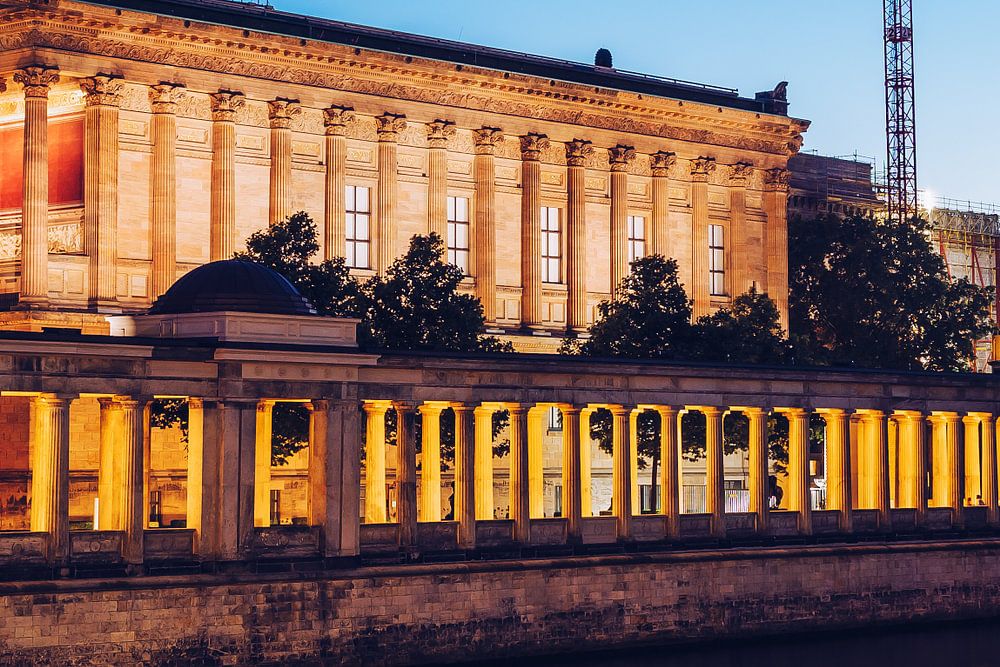 A blue hour shot of the Berlin Museum Island, with a view over the Spree river onto the Alte Nationalgalerie.