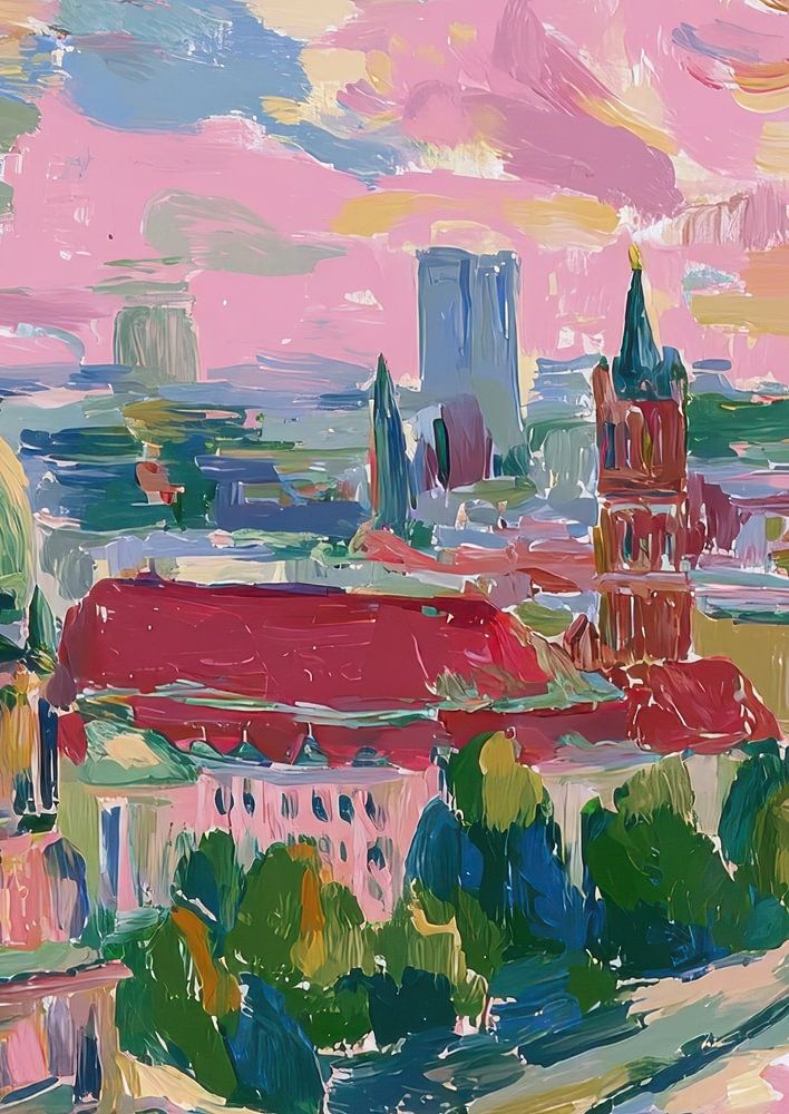 This oil painting shows the Berlin skyline in the style of Henri Matisse. A pink sky, green buildings and colourful brushstrokes lend vibrancy to the scene. The domes of the Brandenburg Gate and a red-roofed church can be seen in the foreground, while the large television tower dominates the composition on the right. Bold, expressive brushstrokes capture movement and energy, while the harmonious colour palette artistically conveys the impression of the city. The work combines Matisse-inspired colouring with urban architecture and creates a dynamic, modern depiction of Berlin.