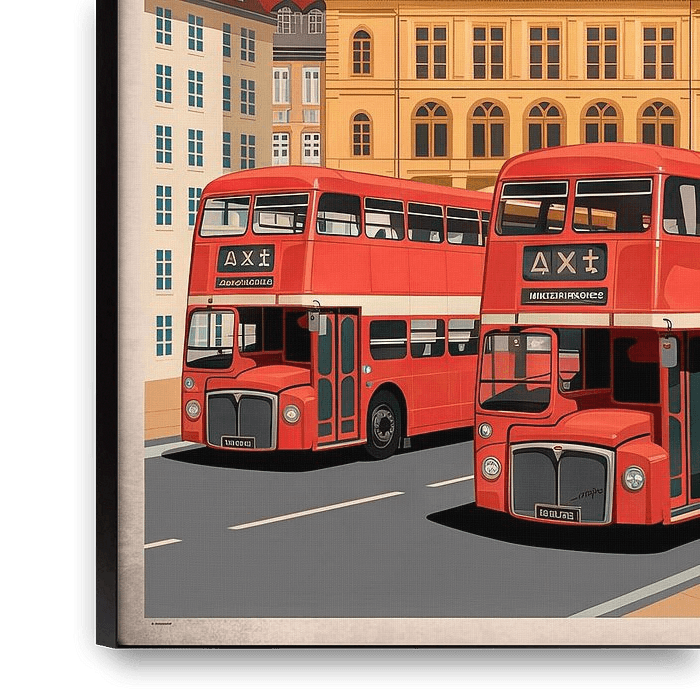 A lively cityscape unfolds: two magnificent red double-decker buses stop in front of a majestic building, its elegant dome rising into the sky. Clouds play with the sunlight and lend the scenery a dynamic glamour. "Bern" is emblazoned at the top, a reference to the charming capital city that masterfully combines history and…