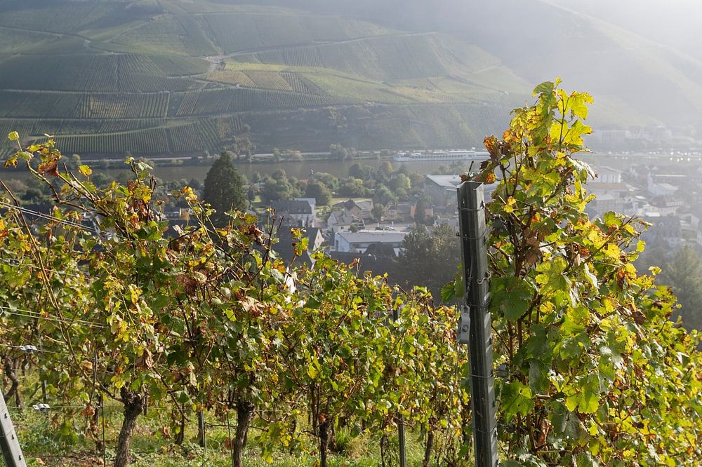 Bernkastel-Kues Germany View from Kueser Plateau as the sun tries to break through the mist. Vineyards on the slopes of the River Moselle., wine, vineyard, vines, produce, product, drinking, agriculture, agricultural, vintner, vintners, wine, wineyard, grapes, grape, bunch, production, local, , Wein, Weinberg, Reben, Produkte, Produkt, Trinken, Landwirtschaft, Landwirtschaft, Winzer, Winzer, Wine, Wineyard, Trauben, Traube, Haufen, Produktion, local,