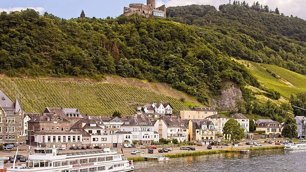 River Mosel in Bernkastel-Kues with pleasure boats and in the background Burg Landshut (Mosel Valley, Germany).