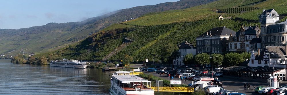 Bernkastel-Kues Germany View from the bridge along the River Moselle as the sun tries to break through the fog. Tourist cruise ships lie moored on the quayside. Vineyards provide a patchwork on the slopes of surrounding hills along the valley.Stitched panorama. , wine, vineyard, vines, produce, product, drinking, agriculture, agricultural, vintner, vintners, wine, vineyard, grapes, grape, bunch, production, local, , Wein, Weinberg, Reben, Produkte, Produkt, Trinken, Landwirtschaft, Landwirtschaft, Winzer, Winzer, Wine, Vineyard, Trauben, Traube, Haufen, Produktion, local,